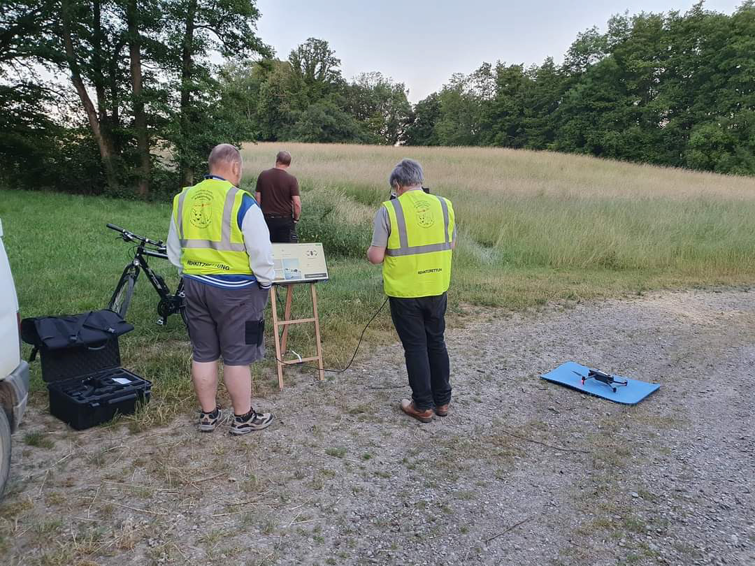 In Neuwiller entdeckte Pilotin, Alexandra Battus, am Samstag Nachmittag vor Pfingsten in einer Wiese nahe der Landes- und Allschwiler Gemeindegrenze bei einem Kontrollflug ein Rehkitz. Die Gefahr, dass sich ein zweites Kitz in dieser Wiese befindet, war gross. Der Landwirt war einverstanden, das Mähen dieser Wiese auf den nächsten Morgen zu verschieben. Beim Rettungsflug am Pfingstsonntag um sechs Uhr morgens wurden tatsächlich zwei Rehkitze in dieser Wiese gesichtet. Kurze Zeit später traf dann auch der Landwirt mit seinem Sohn ein. Da wir Skrupel hatten, den Neuwiller Wildhüter um sechs Uhr früh am Pfingstsonntag um Hilfe zu bitten, informierten wir das Rehkitzrettungsteam aus Allschwil/Schönenbuch, die in Begleitung eines Jägers zur gleichen Zeit in Hagental im Einsatz waren. Das Team schaute vorbei, doch gleichzeitig traf auch der Wildhüter aus Neuwiller ein. Die Jäger und Wildhüter kennen sich hier in der Region, auch über die Landesgrenze hinaus. Somit passten der Schweizer und der Französische Jäger auf, dass den wenige Tage alten Rehkitzen beim Mähen nichts passiert.