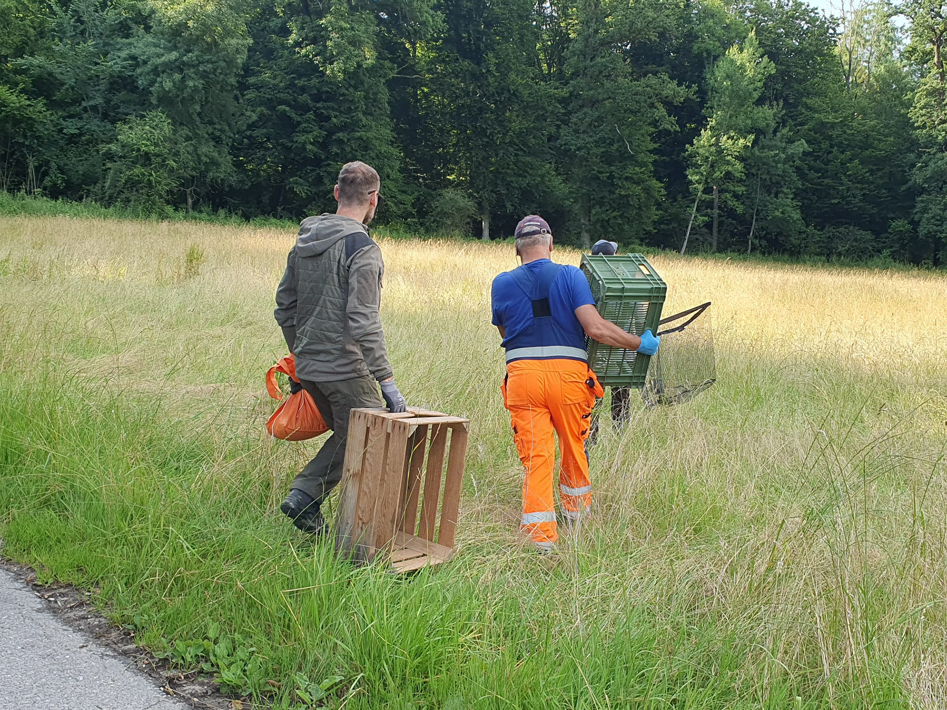 Jäger und Helfer waren rasch im Einsatz und das niedliche Kitz konnte direkt neben der Wiese solange unter einer Harasse in Sicherheit gehalten werden, bis die Wiese gemäht war.