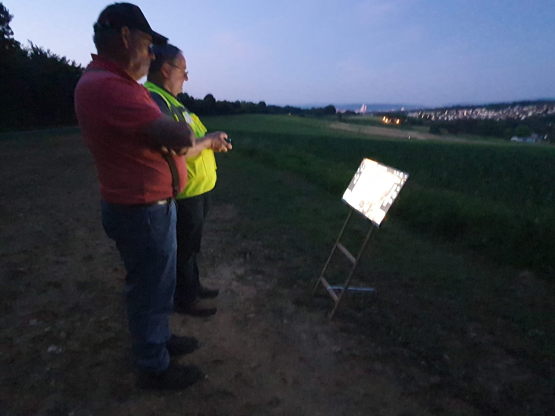 Zwei Bauern melden kurzfristig für Morgen mehrere Wiesen zum mähen an. Das Wetter weiterhin unsicher, entscheide ich am Abend spät diese Wiesen schon mal zu überfliegen. Ich muss aber warten, bis der Regen aufhört - es wird fast 22 Uhr. Nicht unerwartet finde ich zweimal je eine Geiss mit Kitz und einmal Zwillinge mit Geiss. Diese Tiere kenne ich schon von früheren Suchflügen. sie dürften mobil genug sein, aber zur Sicherheit muss ein Jäger aufgeboten werden. Ich informiere also nach der Rückkehr alle Beteiligten und wir vereinbaren 5 Uhr Morgen früh.
