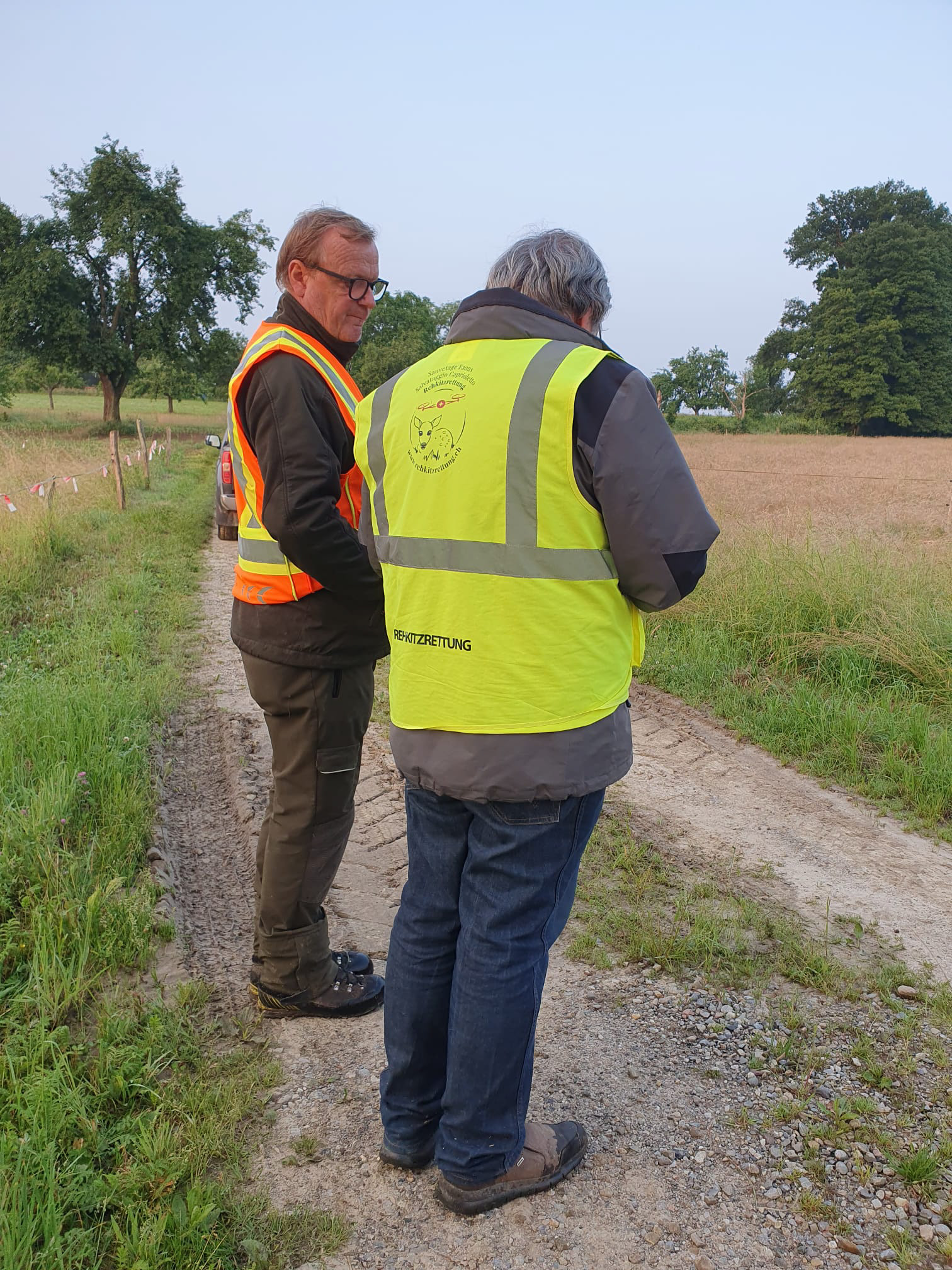 Nach einem Telefonat des anwesenden Jägers mit dem Bauern, einigt man sich darauf vorerst auf das Mähen zu verzichten. Bis in ein paar Tagen werden die Kitze gross genug sein, frühzeitig das Weite zu suchen.