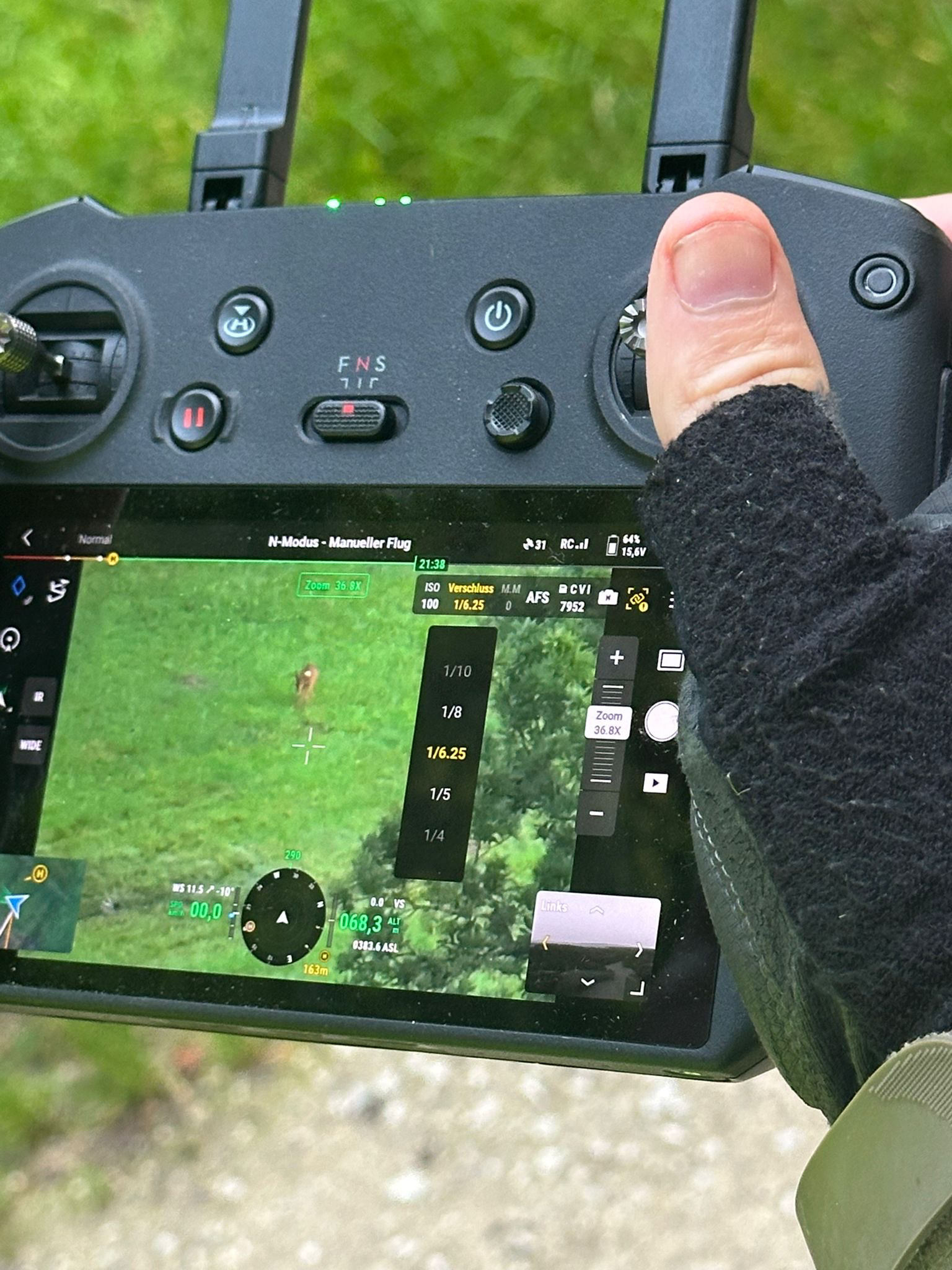 Wir sind also wieder über 6 Stunden im Einsatz. Möglich ist das nur mit viel Goodwill den Kitzen zuliebe und einer Powerbank zum Nachladen der leeren Akkus. Auch auf der letzten geflogenen Wiese findet sich noch ein Kitz. Es verabschiedet sich aber schon frühzeitig in den Wald. Ohne unseren tapferen Jäger, wär's diesmal schwierig geworden - Danke Peter!