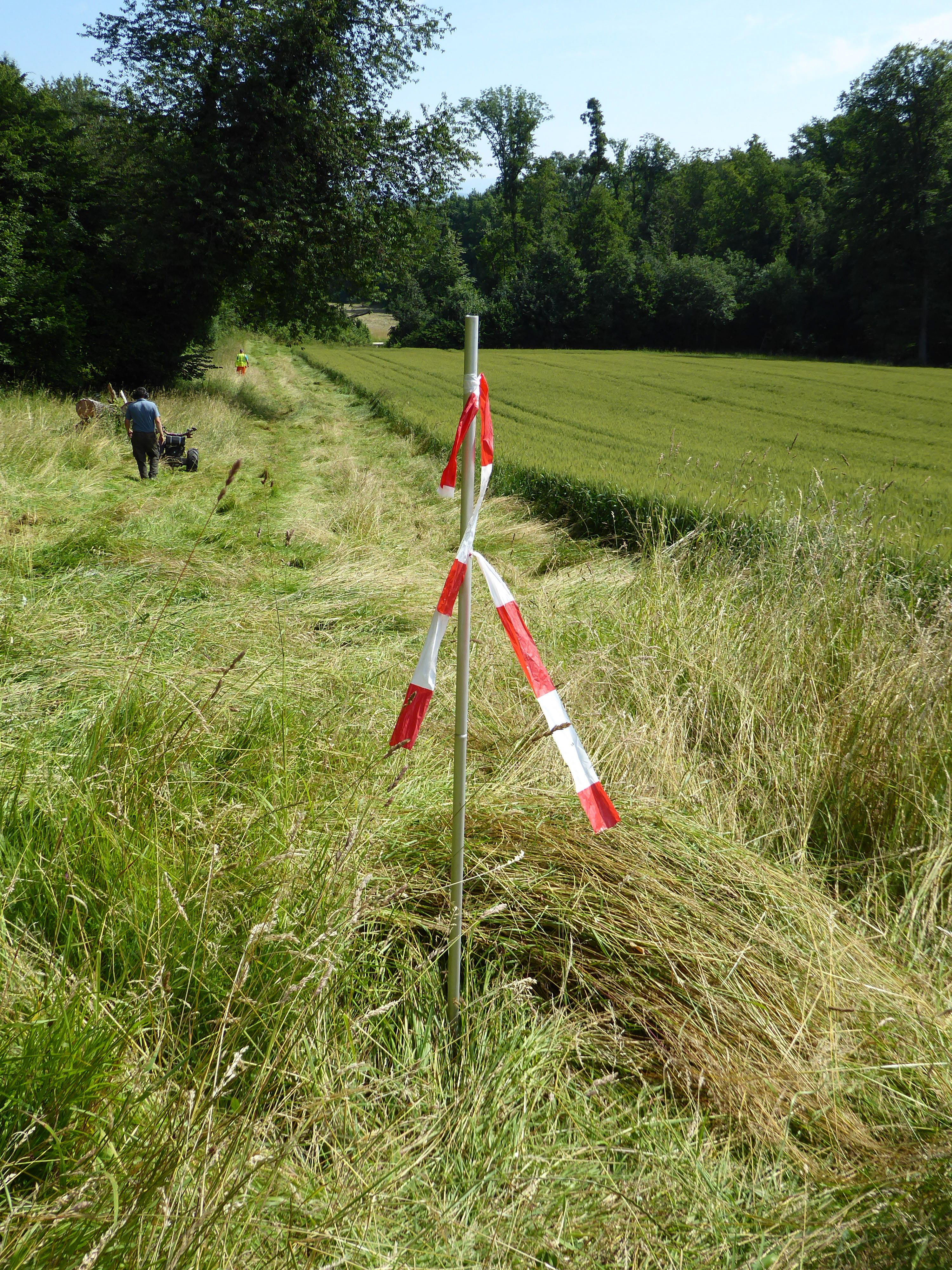 Der gewissenhafte Bauer kommt umgehend nach dem Flug zum Mähen vorbei und einer der Helfer - Pfisti - bleibt zur Sicherheit vor Ort, weil der Waldrand nicht weit entfernt ist. Alles geht gut.